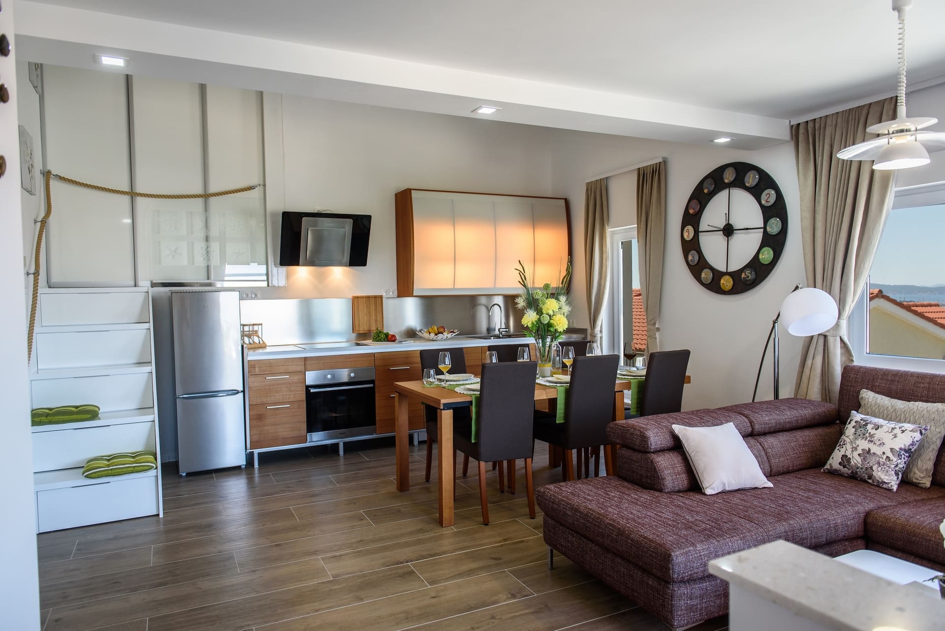 The cottage offers luxury penthouse apartments, modern, air-conditioned apartments with free Wi-Fi, balconies and terraces with sea views. Quiet sunny location with beautiful views of the old town and the sea! The 100m2 roof terraces with open sea views.