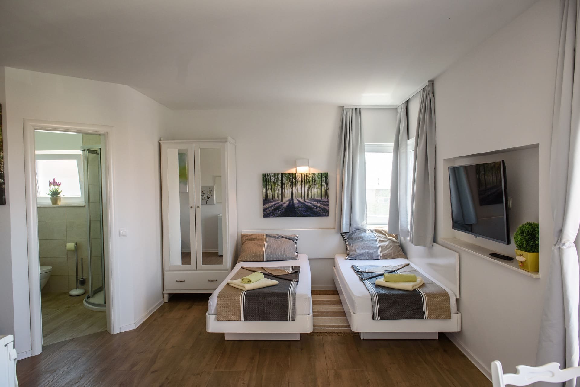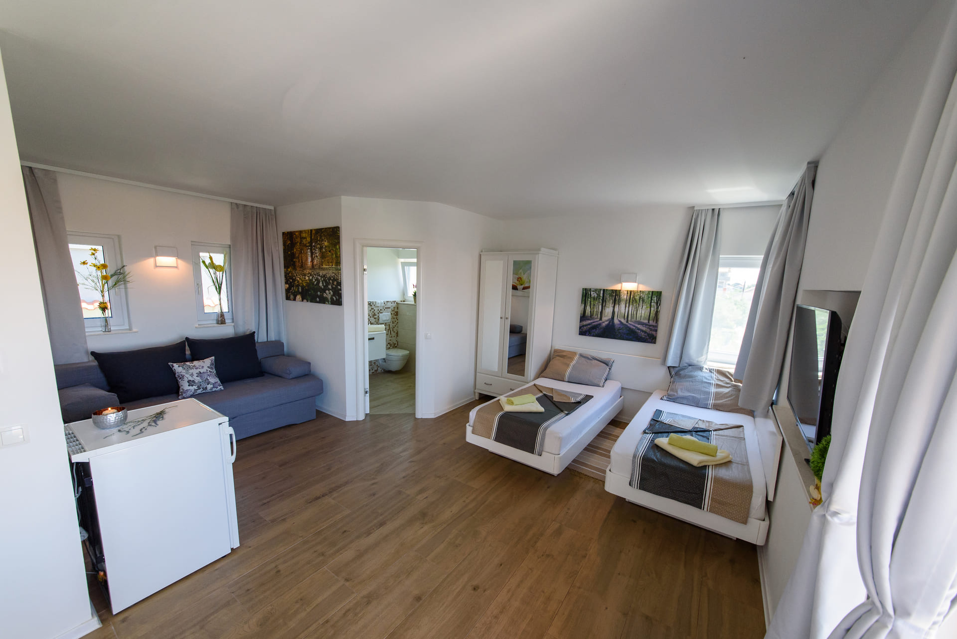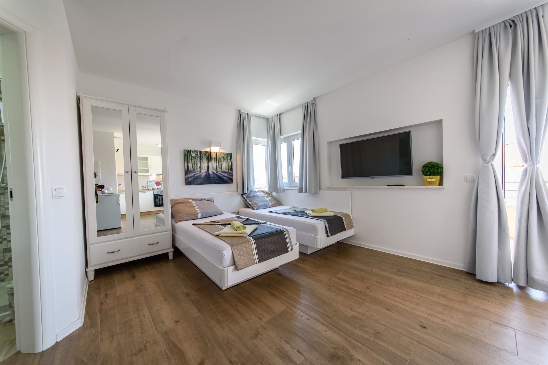 - 1 bedroom with a double bed(180 x 200 cm), separable if necessary, 2 nightstands, wardrobe and bed linen