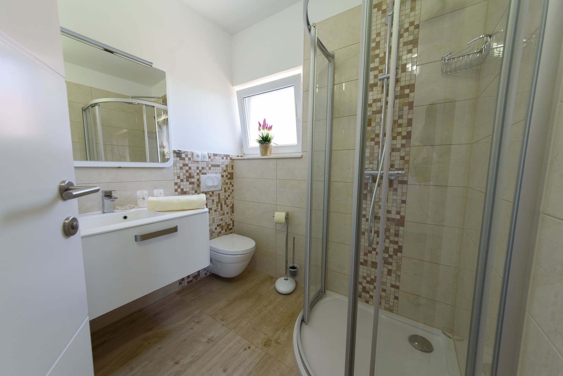 - 1 bathroom with shower, washingtable, washing machine, toilet, towels, hair dryer and toilet paper