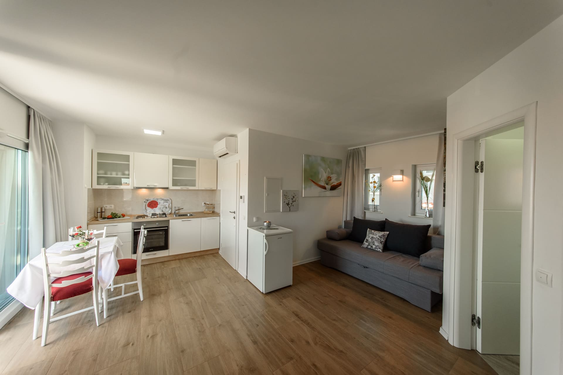 - 1 living/dining room with an extendable sofa, table, chairs and direct access to the balcony with a sea view