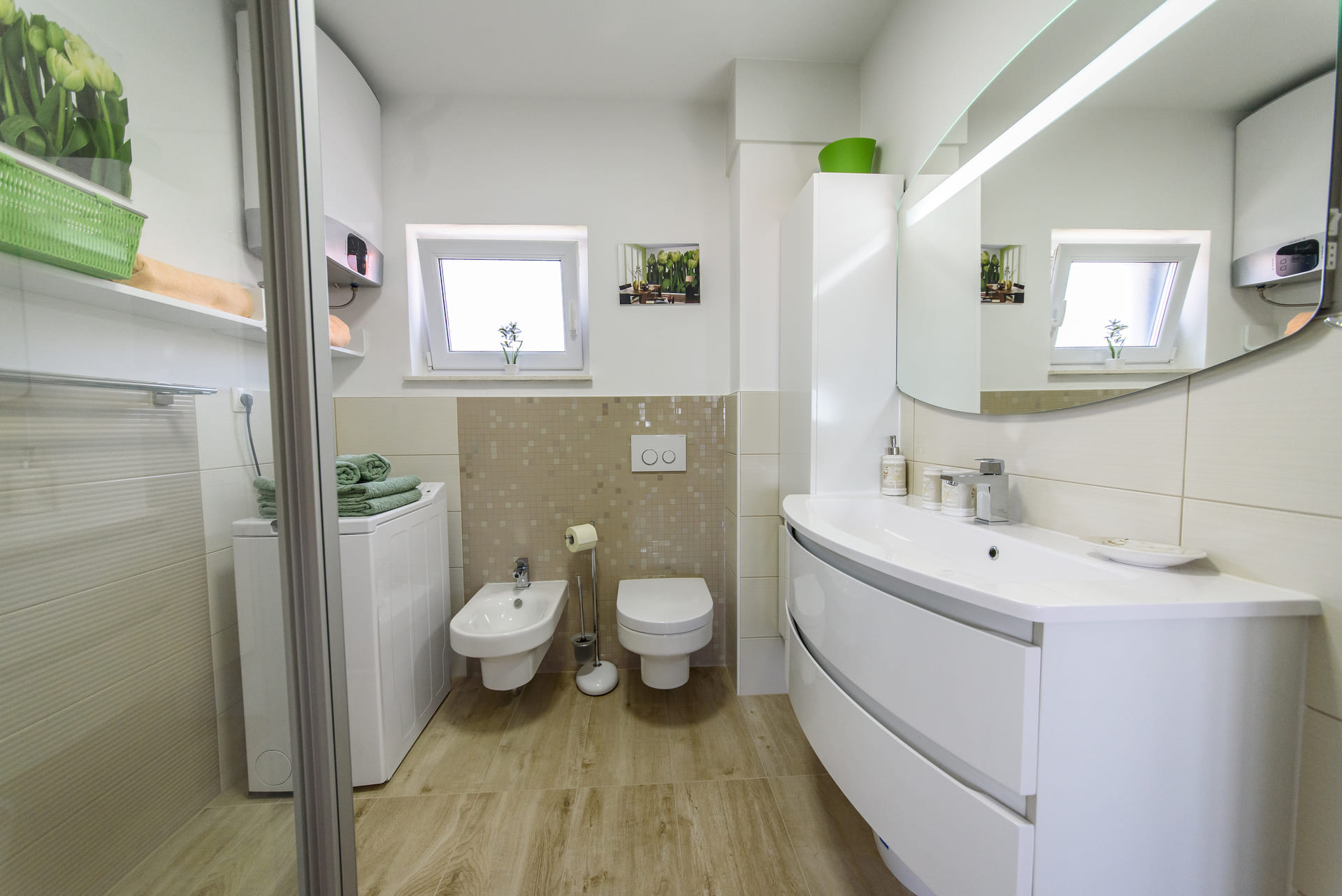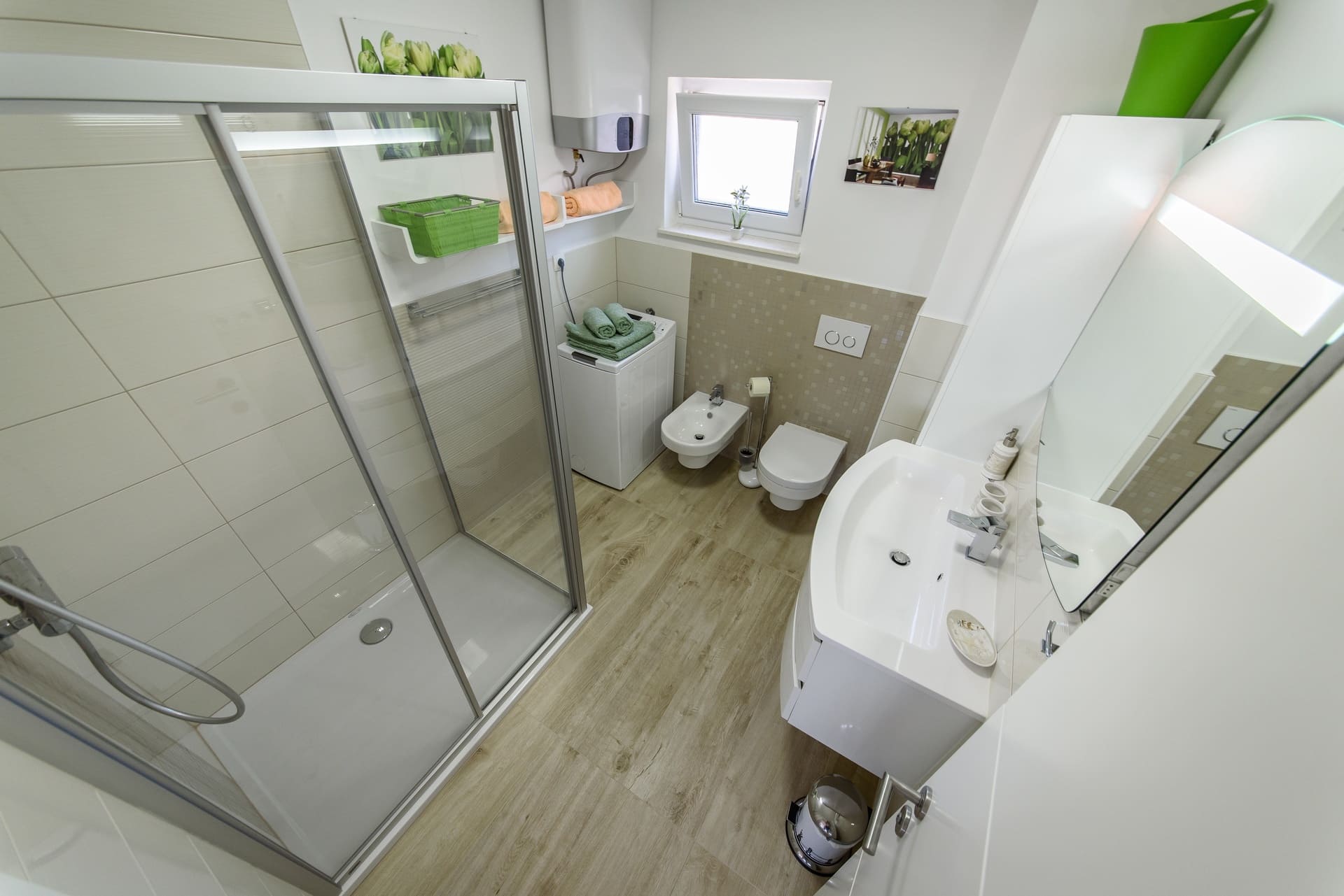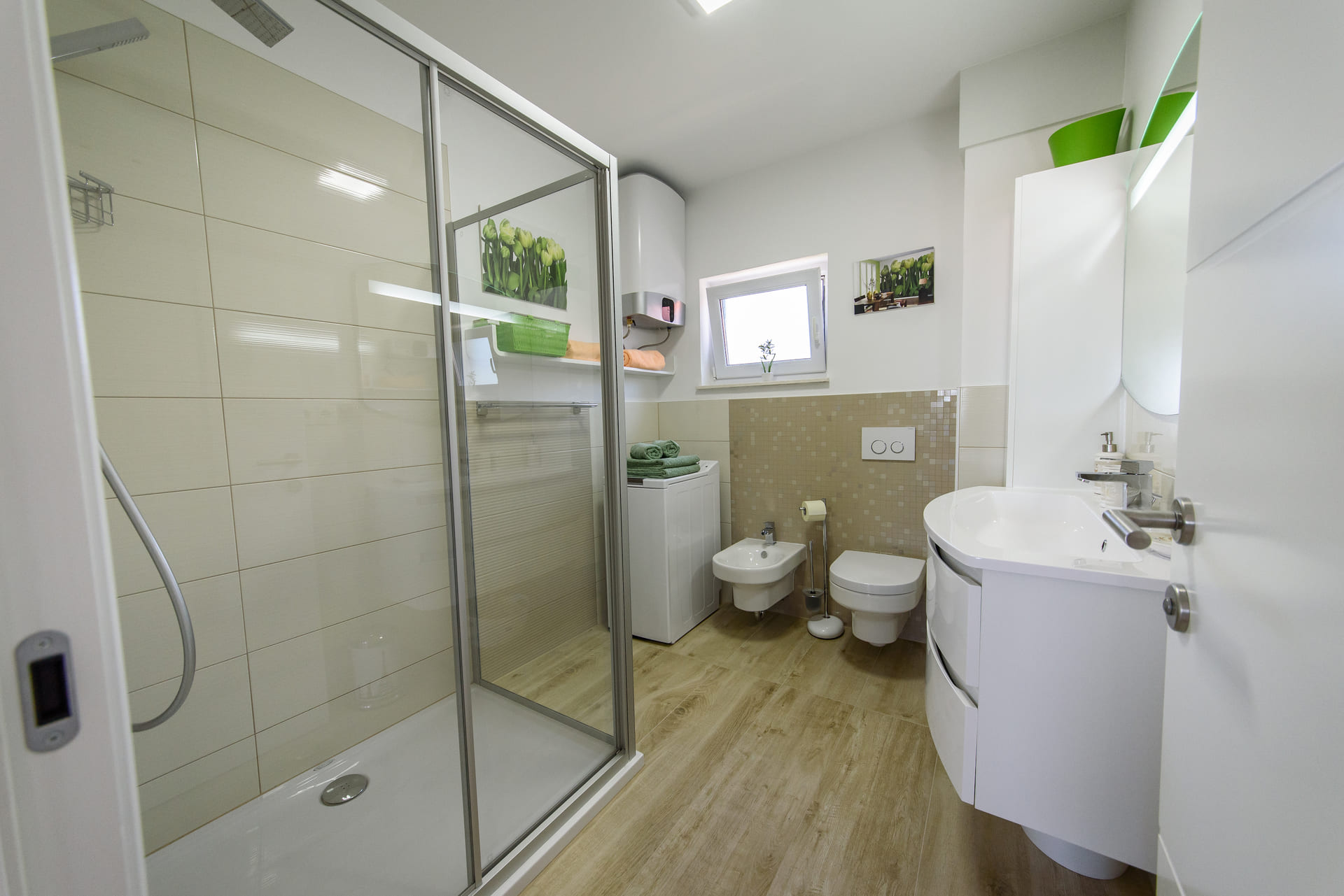- 1 bathroom with a large floor shower, washing table, washing machine, toilet, bidet, bathroom cabinet, towels , hair dryer and toilet paper.