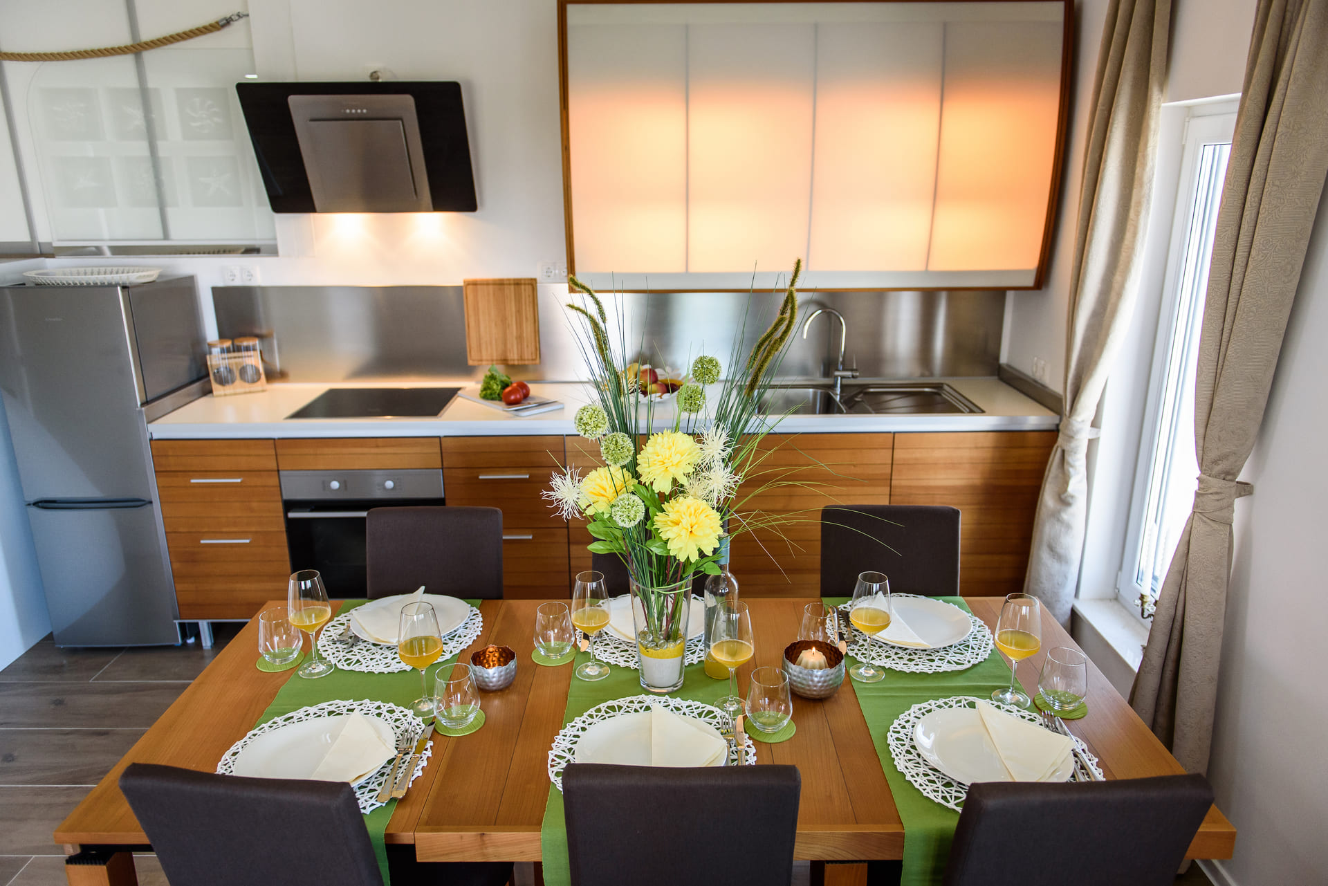 - 1 modern kitchen, fully equipped with an oven, dishwasher, stove, large refrigerator with separate freezer, coffee maker, kettle, toaster, crockery, glasses, cutlery, cookware, dining utensils, tea towels etc.