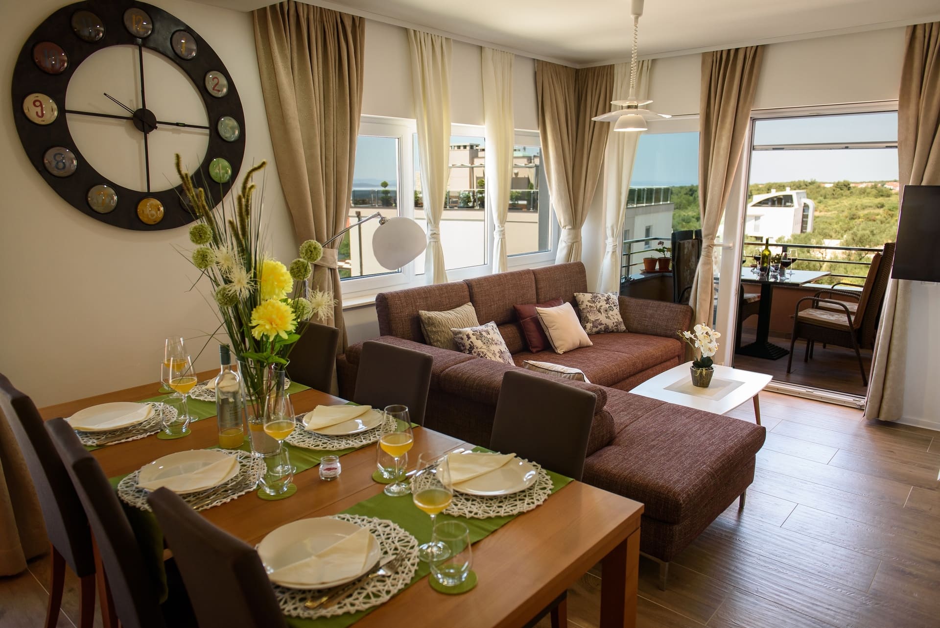 - A sea view balcony and a sea view roof terrace with table and chairs, loungers, etc.
